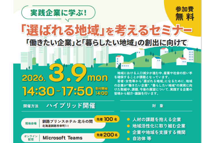 北海道経済産業局は、人口減少や人手不足などの企業や地域の課題に対応するため、「実践企業に学ぶ!「選ばれる地域」を考えるセミナー」を、リアルとオンラインのハイブリッド形式で開催する。