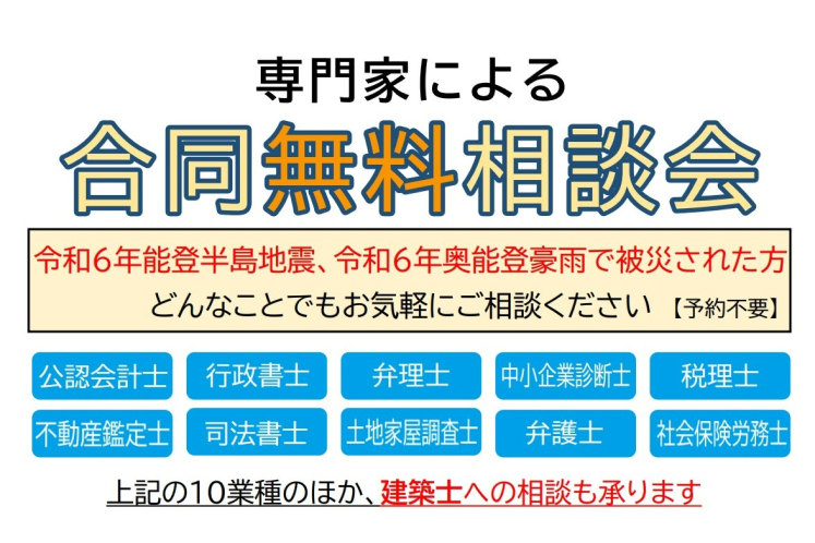 石川県は、能登半島地震や奥能登豪雨で被災した事業者・住民を対象にした「10業種の専門家による合同無料相談会」を2月14日に志賀町の富来活性化センター町民中ホールで、同21日に能登町の能登七見健康福祉の郷「なごみ」和室で開催する。
