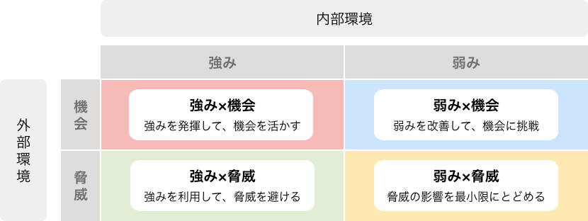 クロスSWOT分析では、内部環境と外部環境を組み合わせて、「強み×機会(積極化)」、「強み×脅威(差別化)」、「弱み×機会(改善)」、「弱み×脅威(防衛・撤退)」という4つのパターンで、戦略を明確にします。