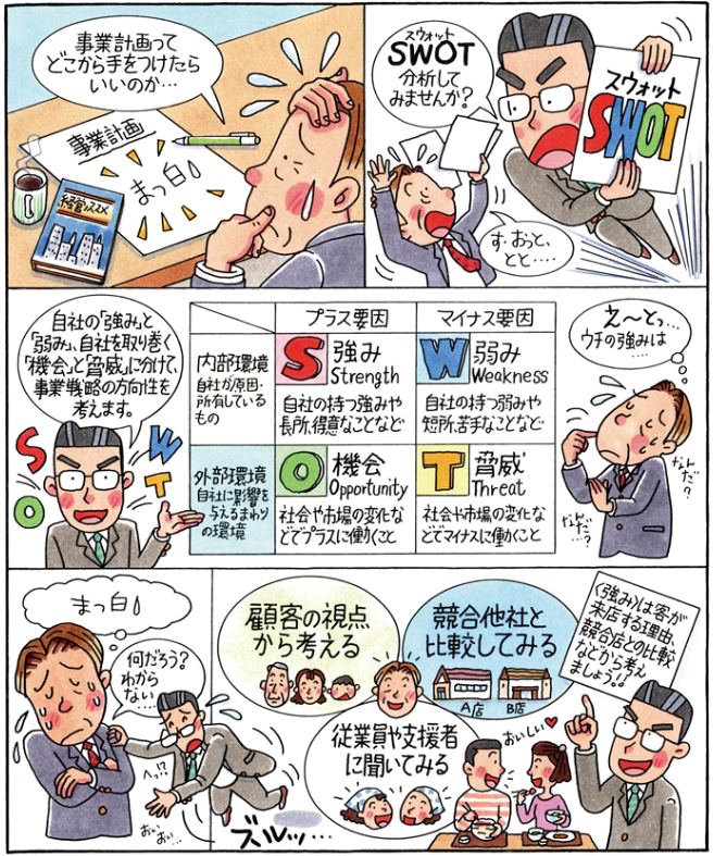 事業計画書の作成にあたって、はじめに会社の状況を把握しておくことが大切です。そのための方法の一つに、「SWOT(スウォット)分析」があります。