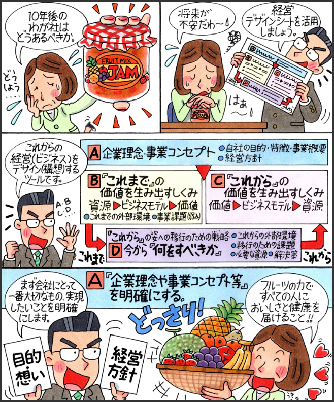 経営デザインシートは、自社の事業計画や補助金申請書の作成にとても役立ちますし、後継者や従業員と一緒に考えてみると違った価値に気が付くかもしれません。今回のマンガでわかるシリーズでは「経営デザインシート」についてご紹介します。