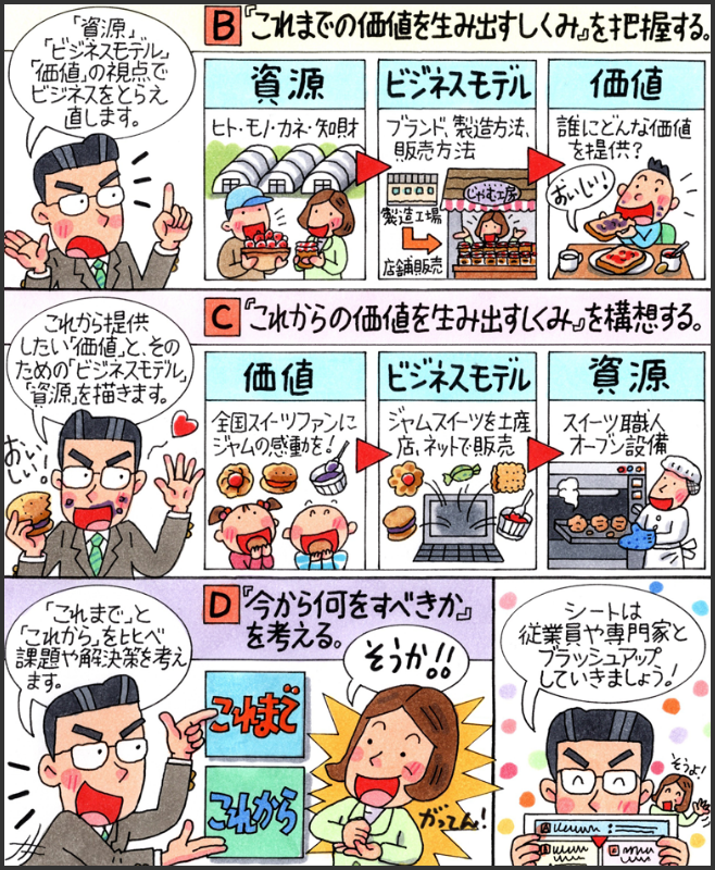自社(事業)を持続的に発展させていくためには、「これからの価値を生み出すしくみ(価値創造メカニズム)」を描き、「いま何ができるのか」を考え、行動していくことが求められます。