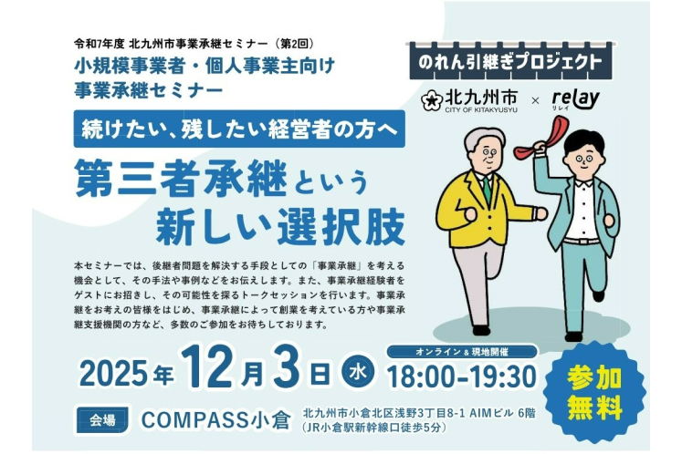 福岡県北九州市は、小規模事業者・個人事業主向け事業承継セミナー「第三者承継という新しい選択肢」(後援:福岡県事業承継・引継ぎ支援センター)を12月3日にCOMPASS小倉(北九州市小倉北区)で開催する。イベント -