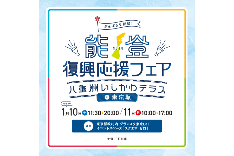 石川県のアンテナショップ「八重洲いしかわテラス」は、能登半島地震から2年を迎えたのを機に「能登復興応援フェア~八重洲いしかわテラスin東京駅~」を1月10、11日にJR東京駅構内の地下1階イベントスペース「スクエア ゼロ」で開催する。イベント -