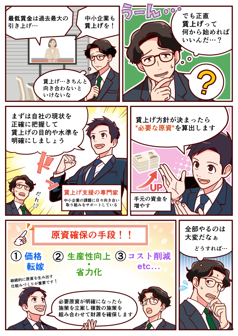 従業員の賃上げを行いたいと思っていますが、何から手をつけて、どのように進めればよいか分かりません。基本的な流れや具体的な施策、また国の支援策があれば教えてください。