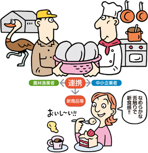 「農林漁業者と商工業者等が通常の商取引関係を超えて協力し、お互いの強みを活かして売れる新商品・新サービスの開発、生産等を行い、需要の開拓を行うこと」です。
