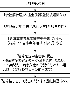 会社の解散の日の翌日より1年間を1事業年度(破産手続開始決定などによる解散の場合は定款に定めた事業年度)とみなして、2月以内に申告及び納税をしなければなりません。ただし、残余財産の確定の日を含む事業年度を除きます。この場合の所得金額の計算は、原則として解散をしていない場合の所得金額と同じです。