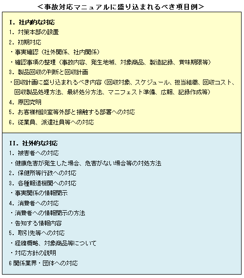 食品事故はいつ発生するかわかりません。発生した場合には全社一丸となって迅速に対応しなければなりません。そのためには平常時からの事故対応準備が行われている必要があります。