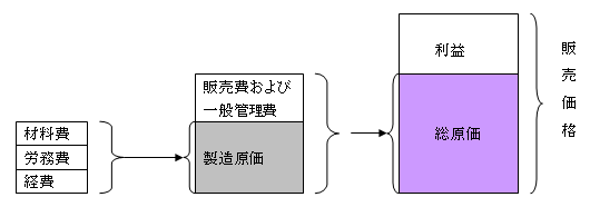 「製造原価」と「販売費及び一般管理費」を合計したものが「総原価」となります。そして販売価格と総原価の差額が利益となります。
