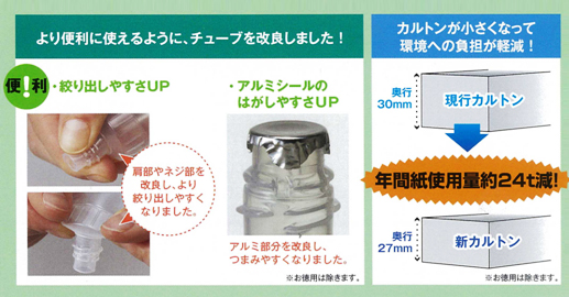チューブの改良に併せてノズル先端のアルミ蓋の形状も変えた。従来よりもアルミ蓋をやや大きくし、指でつまみやすいように三角形にした。その目的はユニバーサルデザインにあり、指でつまむ力の弱くなった高齢者でもはがしやすくするための改良だった。