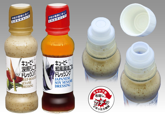 ドレッシング容器の中栓を簡単にあけられる。いままでのようにキャップをあけてから中栓の上面にあるプラスチックリングを引っ張る必要がない。2010年2月、キユーピーはそんなイージーオープンな容器のドレッシングを発売した。