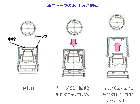 まず、左側の図がキャップをあける前(開封前)の状態。中栓に上ふたがはめられている。そして中央の図のようにキャップを右に回すと、キャップ裏側の溝に上ふたがはまり込み、キャップを左に回して外す際には上ふたもキャップ裏に付着したまま外れる(右側の図)。