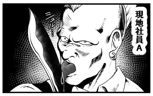ナイフに舌を這わし、こちらを睨みつける現地社員A、指ぬきグローブに太いチェーンを握りしめ、ジャラリと音を立てる現地社員B、咥え煙草で薄ら笑いを浮かべる現地社員C。一つ所に集う彼らに不穏な気配を感じ、「お前ら、何やってんの?」と声をかけたアフロに、彼らは「特に何も指示されていないからサボってます。」と答える。「仕事せえよ」と凄むアフロに「あ…はい。」と素直に答える現地社員だった。仕事に対する考え方は国によって様々です。
