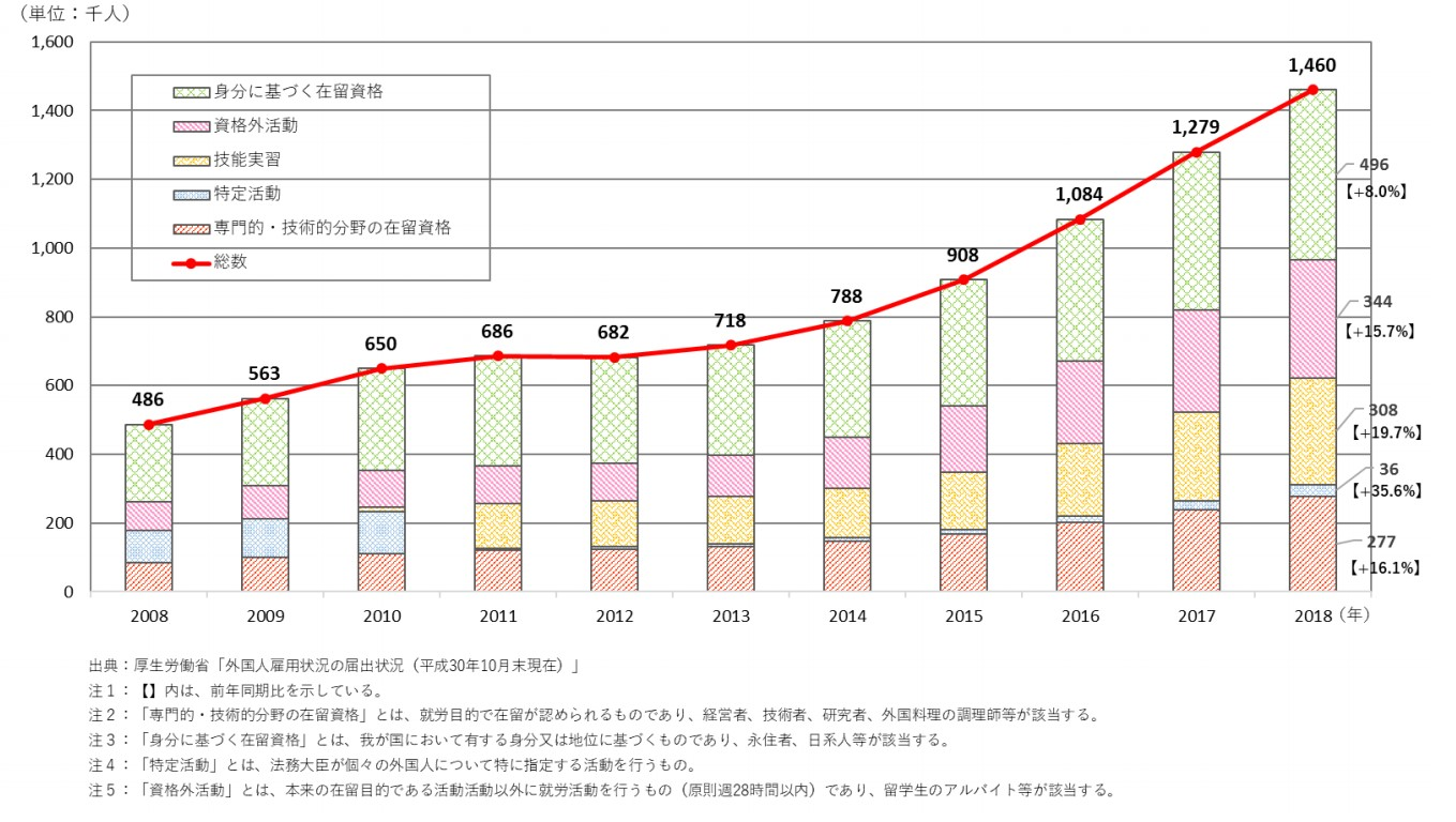 厚生労働省が発表している「外国人雇用状況」の届出状況によると、外国人労働者は2018年10月末時点で約146万人(前年同期比14.2%増加)と過去最高を更新、2008年と比べると3倍に増えている。人手不足が深刻になる中で、外国人労働者の4分の3が従業員数499人以下の事業所で働いており、中堅・中小企業にとってなくてはならない存在になりつつある。
