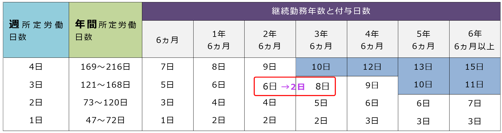 (例)労働者が時季指定した日数2日、計画年休の日数2日の場合