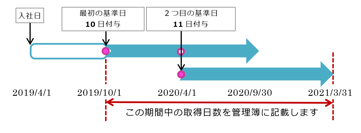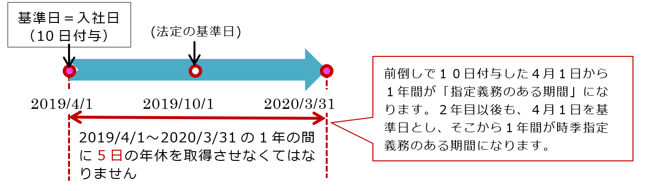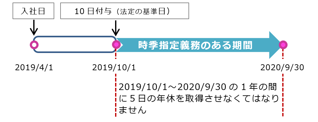 使用者は、労働者ごとに、年10日以上の年休が付与された日から1年以内に、時季を指定して取得させなくてはなりませんが、そのタイミングは、1年間の期首に限りません。年休の取得状況をみながら、期間の途中で行うこともできます。年休が付与された日(「基準日」)と「時季指定義務のある期間」の関係は、4月1日入社の人の例で見ると以下のようになります。