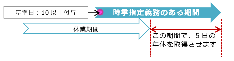 答えは、図表5.の赤矢印の期間です。つまり、復帰した日から、もともとの「時季指定義務のある期間」の残りの期間中で時季指定することになります。ただし、残りの期間が5日に満たないならその日数でということになります。