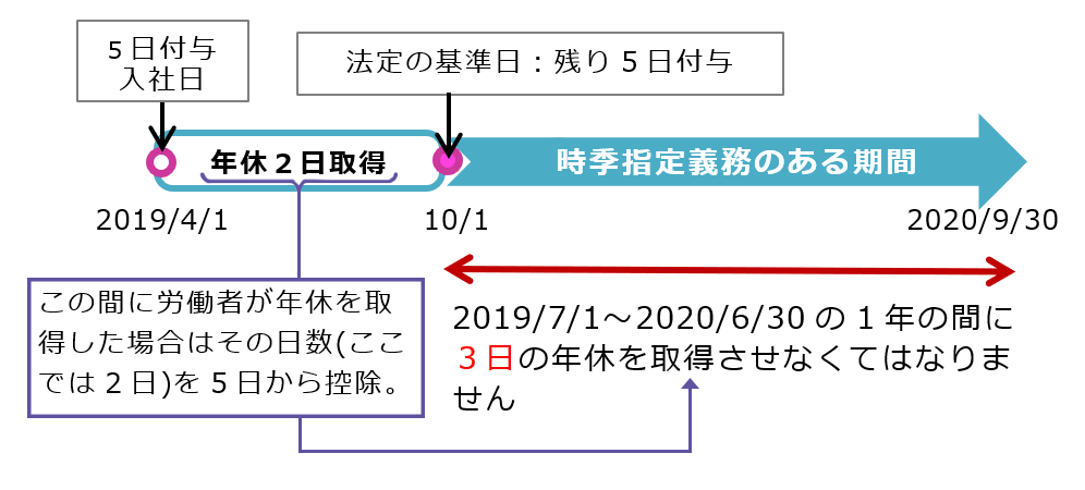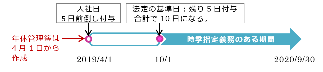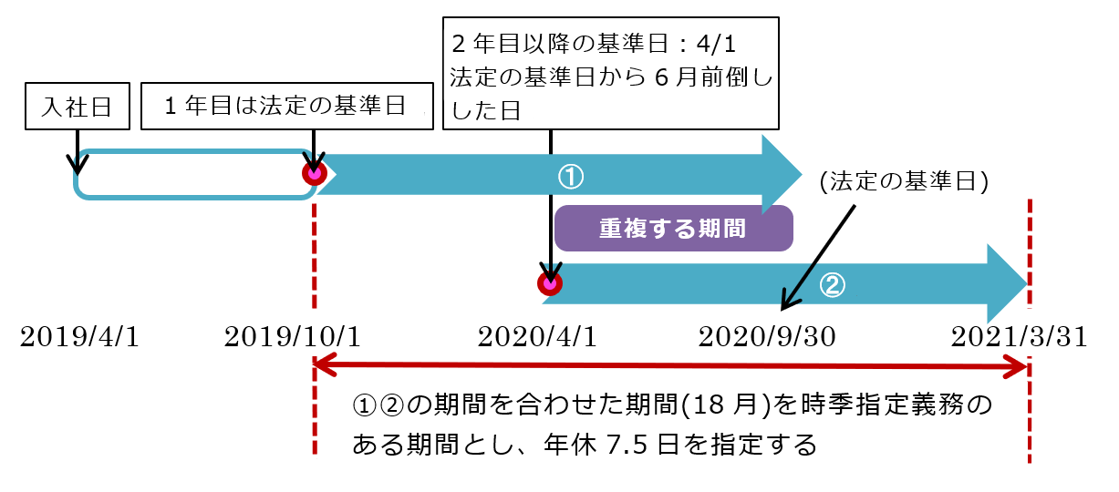 ① 「法定の年次有給休暇日数が10日以上」とは、改正法の施行日である2019年4月1日以後に新たに付与された年休が10日以上、ということです。2019年3月31日以前に付与された年休は、10日以上あっても時季指定の対象にはなりません。