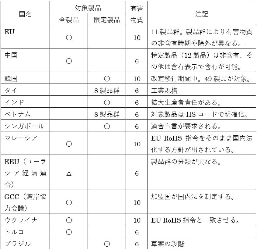 国内法化するときに、EU RoHS指令(2011/65/EU)をそのまま取り込んでいる場合、EU RoHS指令の旧版(2002/95/EC)を取り込んでいる場合、あるいは独自の規制にしている場合など様々です。また、EU域外国の国内法も随時改正がなされますので、最新情報を確認する必要があります。
