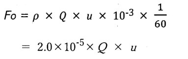 エアブローが対象ワークに及ぼす作用は、ワークとの衝突面での運動量変化になります。ブローが直角に当たる部分での全推力Fo[N]は、次式のようにノズル出口における圧縮空気の質量流量と速度の積で表されます。
