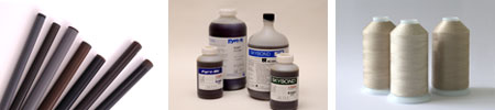 世界シェアNo.1を誇るI.S.T社製の「ポリイミド・トナー定着チューブ」(写真左)、I.S.T社製のポリイミド樹脂「Pyre-M.L.」「SKYBOND」(写真中央)、I.S.T社製の不燃縫製糸「ISTFLONヤーン」(写真右)