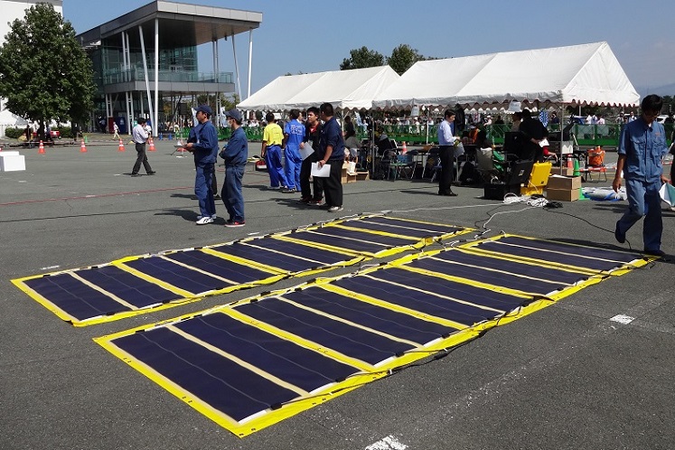 形状はシンプルだが、完成までには苦労もあった。黄色いテントシートにフィルム型太陽電池を2枚貼っているのだが、シートにフィルムを縫い付けることのできる企業が長崎県内にはなく、対応できる企業を探した結果、栃木県の縫製メーカーに依頼することとなった。また、軽さを追求するとシートが飛んでいってしまうため、ある程度の大きさや重みが必要となる。形状についても試行錯誤を重ねた結果、シートの重さは3kg程度とし、軽乗用車のトランクに積み込めるサイズとした。
