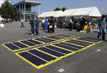 現場で使用する場合には、このシートを10枚つなげる。これで920Wも発電することができ、かつ電気を使いながら充電することもできる。持ち運びのできる結晶系太陽電池装置でこれだけの発電量を確保できるものは他にない。