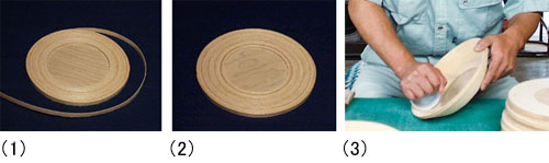 ブナコの加工工程。(1)ブナ材をテープ状に成形⇒(2)コイル状に巻き重ねる⇒(3)湯呑茶碗などの道具で押出成形する