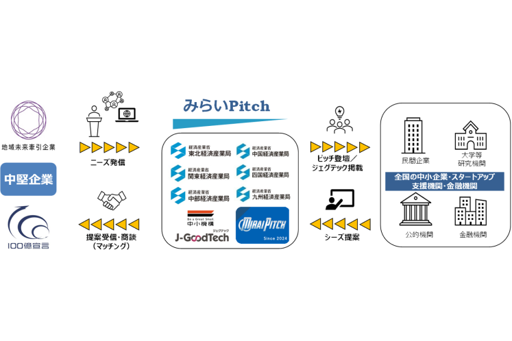 中小機構は、東北、関東、中部、中国、四国、九州の各経済産業局と連携し、100億宣言企業・地域未来牽引企業などのさらなる成長に向けた新事業創出プロジェクト「みらいPitch」の第4回ピッチイベントを2月26日、経済産業省別館「共創空間ベツナナ」で開催する。