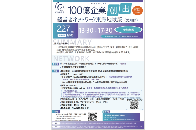 中小機構中部本部は、中部経済産業局、日本政策金融公庫、商工中金とともに「100億企業創出経営者ネットワーク」を2月27日、東海地域で初めて開催する。